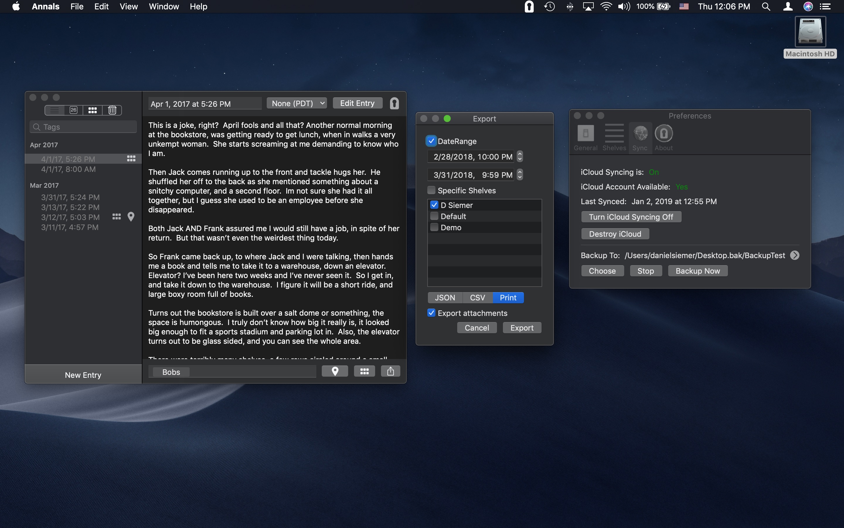 Annals can store it's data in iCloud, using CloudKit Don't want to use iCloud? We understand that not everyone wants it, and it's use is completely optional